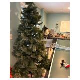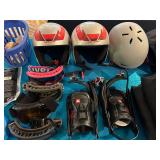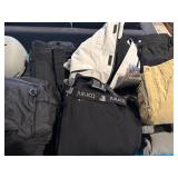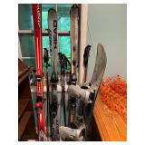 Game room furniture including fabric couch, pingpong table, misc small cabinets, side chairs, skis & ski clothes, snow boards