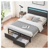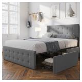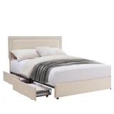 Queen Bed Frame with 4 Storage Drawers, Beige Upholstered Platform Bed with Headboard and Wooden Slats Support