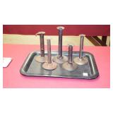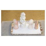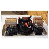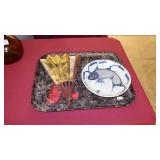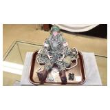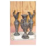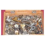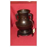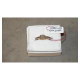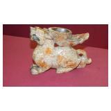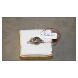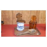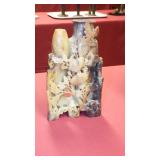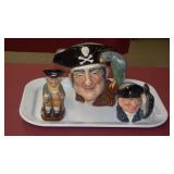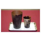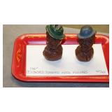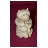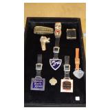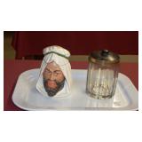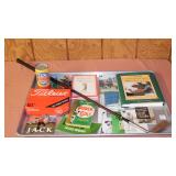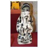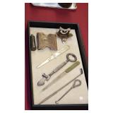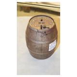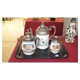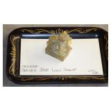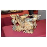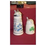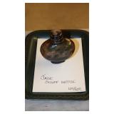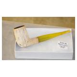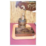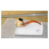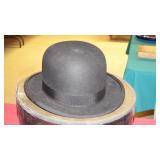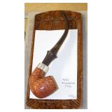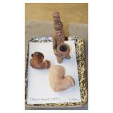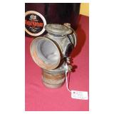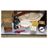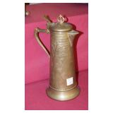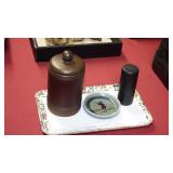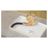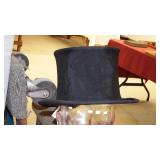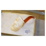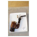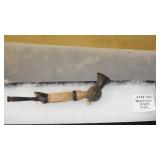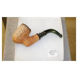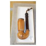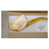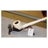 STONEWARE "BLIND PIG" FOOTED KEG, CANDLE LANTERN, LIVERPOOL WOOD CANDLE BOX, WMF ART NOUVEAU COPPER PITCHER, 9" JAPANESE BRONZE FOOTED VASE, CARVED STONE AND JADE PIECES, CARVED JADE CHESS SET, JADE SNUFF BOTTLE, ANTIQUE COLLAPSIBLE SILK TOP HAT & DERBY HAT, 25" WOVEN LAUNDRY BASKET, CAST IRON: GRISWOLD No. 18 MUFFIN PANS & 9" SKILLET, WAGNER WARE 8" SKILLET, LARGE COLLECTION OF PIPES INCLUDING MEERSCHAUM, HILSON FANTASIA, BARI MATADOR, BLOCK, BRUYERE GARANTIE, WDC WELLINGTON, ETC... ANIMAL HORN DRINKING CUPS, No.2 COUNTRY STORE CAST IRON SCALE, SEVERAL PUSH UP/HOG SCRAPER CANDLESTICKS, 9" CHINESE PORCELAIN FISH PLATE, ANTIQUE BADGER BRASS SOLAR BICYCLE LAMP, OLD KEYS, "CARIB LAGER" LIGHTED BEER SIGN, WEBCO SCHULTZ & DOOLEY STEINS, ROYAL DOULTON CHARACTER JUGS AND TOBY MUG, STERLING WEIGHTED PEDESTAL CANDY DISH AND HANDLED DISH.
