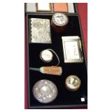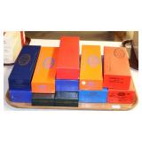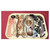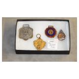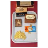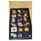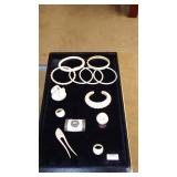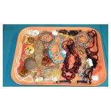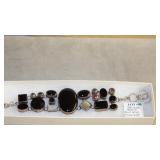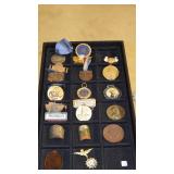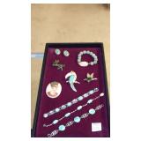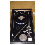 JEWELRY: 14K, 10K & STERLING FASHION RINGS, STERLING AND 14K "RONJON" SIGNED BRACELET, .950 SILVER MEXICO MULTI STONE BRACELET SIGNED "HOB", .800 SILVER CAMEO BROOCHES, UN-SET CAMEOS, ROSS-SIMONS 14K CORAL DROP EARRINGS AND STERLING w/AMETHYST AND TANZANITE BRACELET WITH ORIGINAL BOXES, WEISS SIGNED JEWELRY, CORO CRAFT STERLING RHINESTONE AND ENAMEL BIRD BROOCH, TRAY LOTS OF STERLING AND VINTAGE COSTUME JEWELRY, ANTIQUE WATCH FOBS, ASSORTED MEDALS AND TOKENS.
