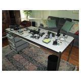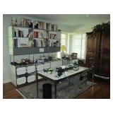 This is a fully furnished home including: USM Haller system desk and storage system, sectional sofa, king bed, queen bed, patio heater, generator, antique oak dining table with draw ends, 8 leather woven chairs, nice cookbooks and a fully furnished kitchen, large assortment of tools, Weber grill. round glass table, ostrich eggs, oak church pew, mid 19th C. cherrywood chest, large assortment of women's clothes and accessories, men's clothes, TV's, audio equipment, nice coffee table, oak chest, modern tables, wine cooler, golf clubs, 6 cane back French chairs, Art deco oak cabinet, linens, a lot of decorative accessories and more. |