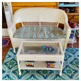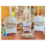 - Weatherware White Outdoor Wicker Loveseat, Armchairs, Tables and Table Lamp