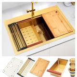 Gold Kitchen Sink, 33” x 22” Drop In Kitchen Sink, Single Bowl Kitchen Sink, Stainless Steel Kitchen Sink, Top Mount Kitchen Sink, Workstation Sink With Accessories