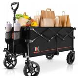 Collapsible Folding Wagon, Wagon Cart Heavy Duty Foldable with Two Drink Holders, Utility Grocery Wagon for Camping Shopping Sports, S2, Black
