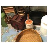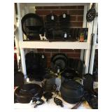 Cast Iron: frying pans, kettles, cooking pots, wash pot, flat irons, corn bread stick pans, 2 Griswold bread pans, scalloped muffin pans, spittoon, dog nut cracker. Sterling hollowware