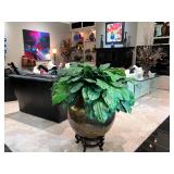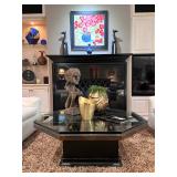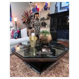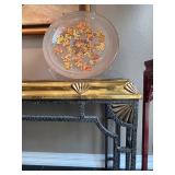 - Custom ‘Robie’ Octagonal Glass Top Cocktail Table in Bronze/Gold Leaf with Ebony Mahogany Finishes and Vintage Brass Top and Hammered Metal Console with Fan/Shell Motif..