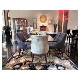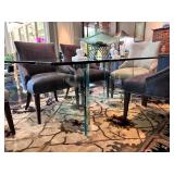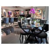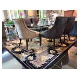 - Rectangular Beveled Edge Glass Top Dining Table with Half Glass Pedestal Bases and ‘Cassie’ Dining Chairs in Unisuede Fabric with Nailhead Details..
