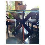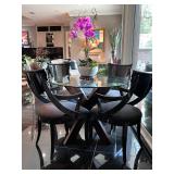 - Set of Four (4) Italian Black Lacquered Wood Grain Dining Chairs in a style designed by Pietro Constantini for Ello Furniture- Circa 1970/80 and Contemporary Glass Top Dining Table with ‘Criss/Cross’ Wooden Base in Espresso..