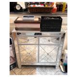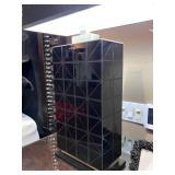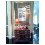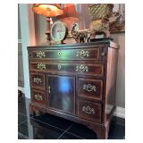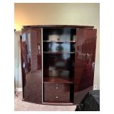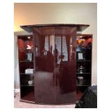 - A dark Flame Mahogany Lacquered Media Cabinet with lighted Side Display Shelving..