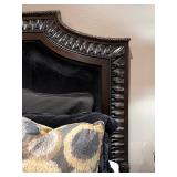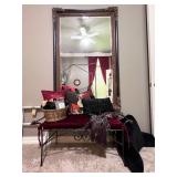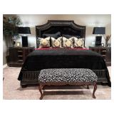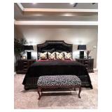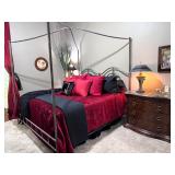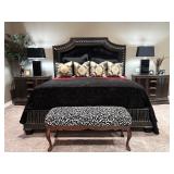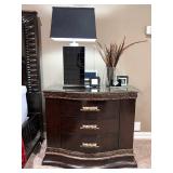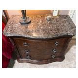 - Marble Top Nightstand in Espresso from Philip Langdon, Wrought Iron Bench with Custom Cushion to an Oversized Antiqued Beveled Glass Mirror..