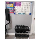 - Keys Five (5) Pair Rubber Hex Dumbbell Set with Stand.. this dumbbell set from Keys Fitness comes in a strong steel rack for convenient and sturdy storage. Each dumbbell is hex-shaped to prevent rolling and features an easy-grip rubber surface for safe strength training. The rubber coating also helps protect the floor when the dumbbells are dropped. The set includes two each of 5#, 10#, 15#, 20# and 25# pound weights, allowing you to vary your workout program and challenge yourself every time. The dumbbell rack is designed with 14-gauge steel and has a powder-coated finish for extended protection and durability..