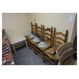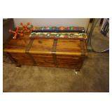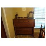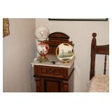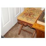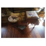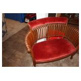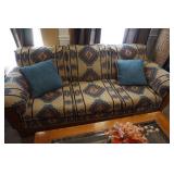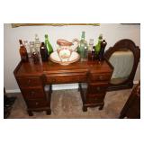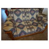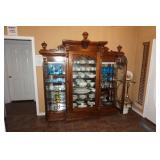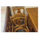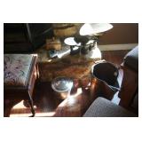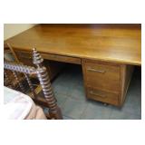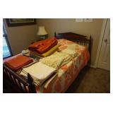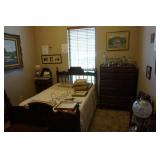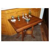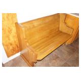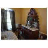 Furniture Dark brown leather sofa sectional, Mission oak upholstered arm chair w/ ottoman, Antique oak round coffee table, Mid century Danish modern coffee table and end table with inlay accents, Primitive pine dining table with assorted antique chairs, Eastlake side table, Bar stools, Small antique oak church pew, Antique cedar quilt chest, Pair of matching Jenny Lind full size beds, Antique empire chest of drawers, Vintage oak side table, Antique walnut full size beds, Tiger oak wash stand, Antique Walnut grouping w/ desk, chest, mirror and night stand, East lake marble top end table, Small oak curio shelf, Ornate red velvet parlor chair, Victorian era dining table and marble top buffet, Victorian era etagere, Vintage brass and marble 2 tier accent table, Mission oak living room grouping w/ southwestern accents, Large antique desk, Cane seat chairs, Misc furniture,