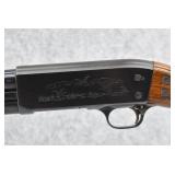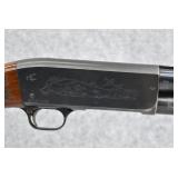 20R. Browning – Mod. 42 Grade V Limited Edition – 410ga. 3” Slide Action Shotgun – 26” Vent Rib Barrel w/Bead Sight and Full Choke – Blued w/Gold Accents – w/Deluxe, Highly Figured Checkered Capped Pistol Grip Wood Stocks w/Factory Black Plastic Butt Plate – w/Highly Engraved Game Scenes on Both Sides of the Receiver w/Hunting Dog Scene on Left Side and Waterfowl Scene on Right Side – Animals are Gold Inlaid – New in Factory Box w/Manuals