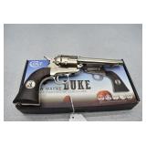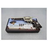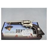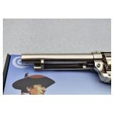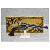 25R. Cimarron – Mod. Wyatt Earp-Buntline – 45 Colt Single Action Revolver – w/10” Barrel w/Blade Front Sight and Notch Rear Sight – Blued/Case Hardened Finish – w/Smooth Wood Grips w/Wyatt Earp Badge on Right Side of Grip – As New