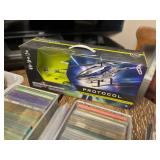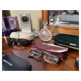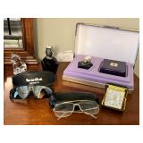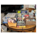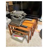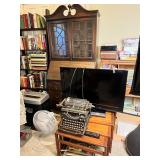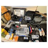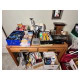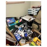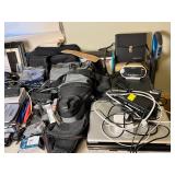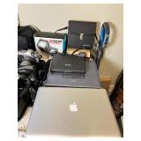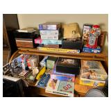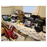 Office supplies, Apple computer, office desk, vintage board games, electronics including cameras, Pentax ZX-50 camera, cases, printers, ink, brand new pens and pencils, Bushnell binoculars, calculators, paper shredder, books, Dyson vacuum, school yearbooks, Shark vacuum, books, Underwood typewriter, guitars, Remington typewriter, and laptop computers by Sony and Asus.