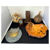 - Lot #19 - Handmade Wood Dish, Wood Tiki, Ceramic Decanter, Carved Gourd & More