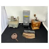 - Lot #182 - Antique Coffee Grinder, Antique Iron, Gyro Stabilizer, Antique Lock & More