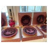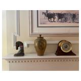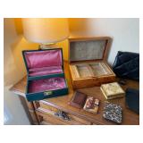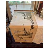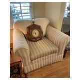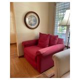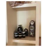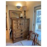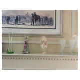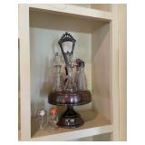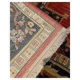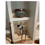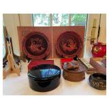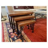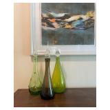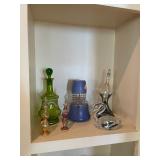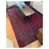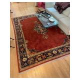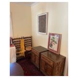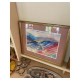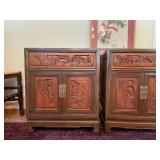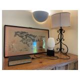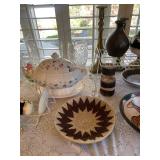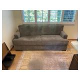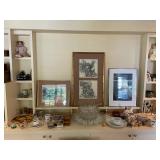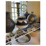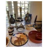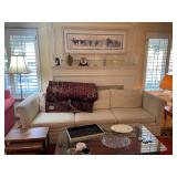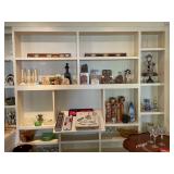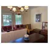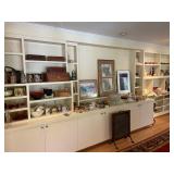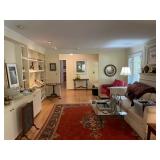 Vintage and modern furniture including, nesting tables, glass coffee table, round scalloped wood table, oversized club chairs, oriental rugs, Turkish rugs, wood carved Asian end table cabinet with double doors, grey microfiber couch, contemporary and modern art, hand-carved Asian Cinnabar plates, Asian art, decorative vases, vintage collectible decanters, blown glass bottles, Native American pottery, lamps,