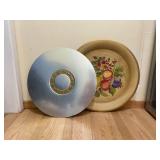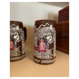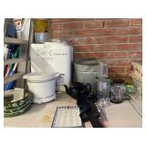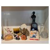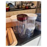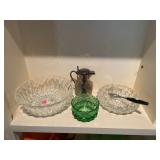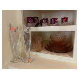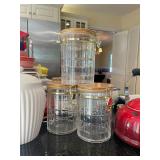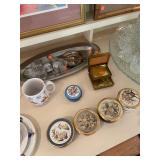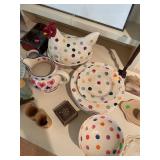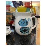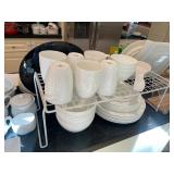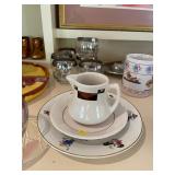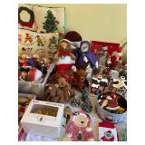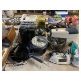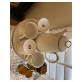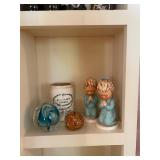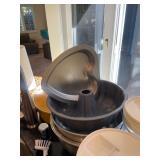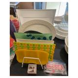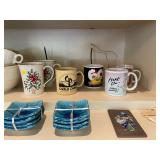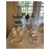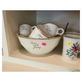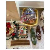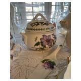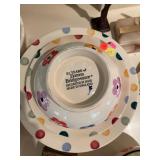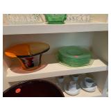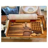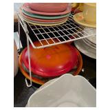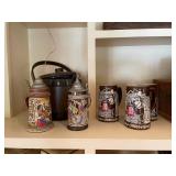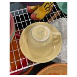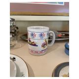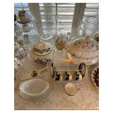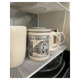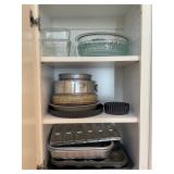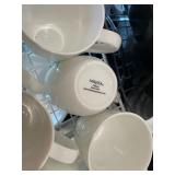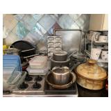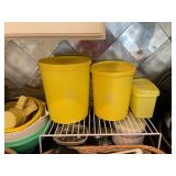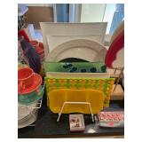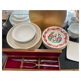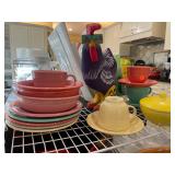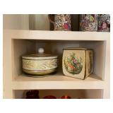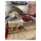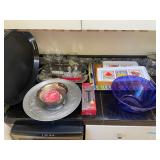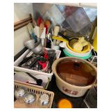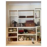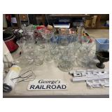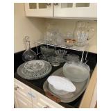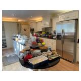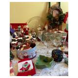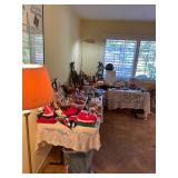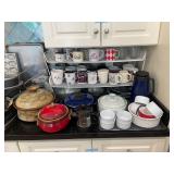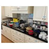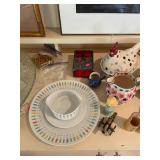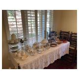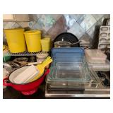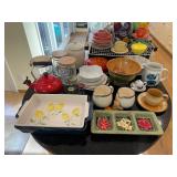 Kitchen items include glass serving platters and plates, glass pitchers, crystal stemware, Mikasa “Trellis” bone China, Corning ware, vintage collectible coffee mugs, mixing bowl sets, casserole dishes, baking pans, canister sets, vintage Tupperware, Emma Bridgewater dish set, beer steins, serving platters, Fiesta ware dishes, and wood cutting boards.
