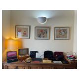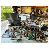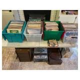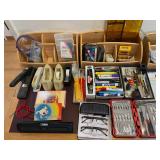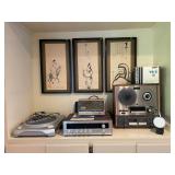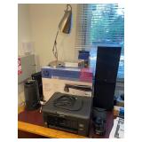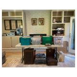 Vintage stereo equipment, including Sony, Boston speakers, office equipment featuring an Epson XP-4200 printer, HP Office Jet Pro 8135e printer, HP Deskjet 2755e, Sony reel-to-reel, Akai speakers, Teac reel-to-reel, vintage Masco portable turntable, AMPEX Micro 42 automobile stereo cassette player/recorder with box, Bose soundwave, vinyl records, cameras including a Mamiya C330 and Go Pro, Fisher 2 channel AM/FM stereo receiver, office supplies, office furniture, bookcases, books, wicker baskets, craft supplies, holiday décor, and lots of treasures!