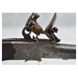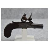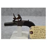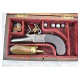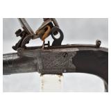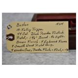 63. Boston Marked – Mod. Falling Trigger – 44 Cal. Black Powder Flintlock Pistol – w/1 5/8” Barrel (No Sights) – Brown Finish – w/Engraved Frame – w/Smooth Wood Pistol Grip – w/Wooden Case, Powder Flask, Flint & Round Ball Bullets