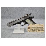 48R.       Springfield Armory – Mod. 1911-A1 “Premier Grade” – 45 Auto Cal. Semi-Auto Pistol – w/5” Barrel w/3-Dot White Sights – Stainless Finish – w/Ebony Grips – Tyler Gun Works Premier Grade, Hand Drawn Art by Rocky Sharp – Slide & Frame Deep Cut Engraved – w/Mag – New w/Factory Box, Soft Case & Manual – A Must See!