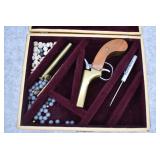 63.          Boston Marked – Mod. Falling Trigger – 44 Cal. Black Powder Flintlock Pistol – w/1 5/8” Barrel (No Sights) – Brown Finish – w/Engraved Frame – w/Smooth Wood Pistol Grip – w/Wooden Case, Powder Flask, Flint & Round Ball Bullets