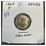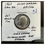 1963 GEM BU ROOSEVELT SILVER DIME MISSALIGNED DIE |
