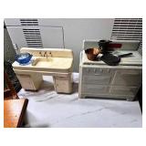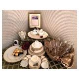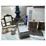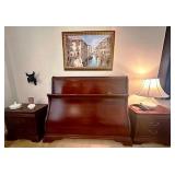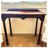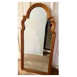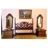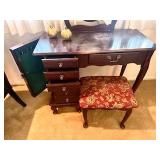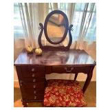 - Queen Anne style cherry wood vanity with mirror, jewelry storage and small cushion bench
