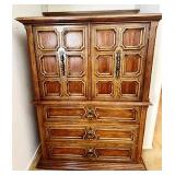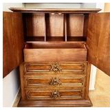 - Drexel Heritage mid-century armoire with two cabinet doors and three drawers with pull drop ring handles