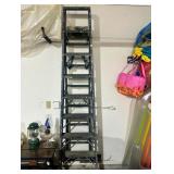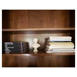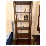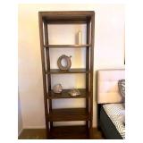 - Two mid-century walnut finish style five-shelf bookcase display shelving