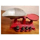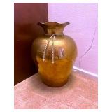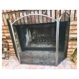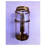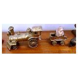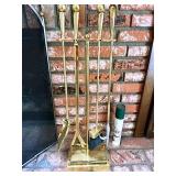 - Vintage solid brass five-piece fireplace tool set with decorative scroll handle