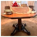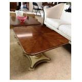 - Henredon fine furniture dining table with wood and black metal base, with two leaf, four chairs and two armchairs with rattan insert backs
