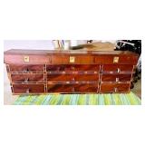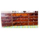 - Drexel Heritage mid-century triple dresser, six drawers with pull drop ring handles, door with three hidden drawers and two mirrors