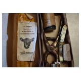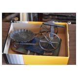 Collectibles: Vintage Bicycles, Coleman Stove, Vintage Scales, Winchester Roller Skates, Winchester Ice Skates, Butcher Knives, Ford Fan, Pottery Crocks and Jugs, Lanterns, Hoists, Canes, Hay Hooks, Snowshoes, Trampoline, Childs Runner Sleds, Wooden Bucket, Decoys, Sad Irons, Folding Rules, Folding Rules, Vintage License Plates, Dated Jars, Vintage Kitchen Utensils, Animal Figurines, Willow Farms Baby Face Bottle, Chicken Crates, Vintage Oilers, Farm Manuals, and Other
