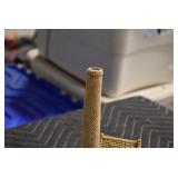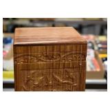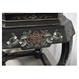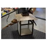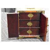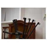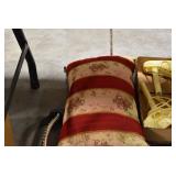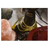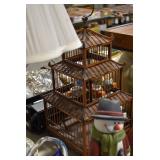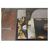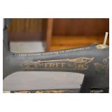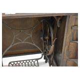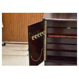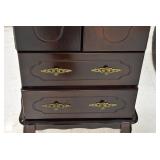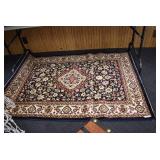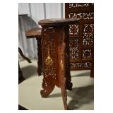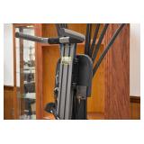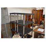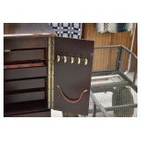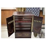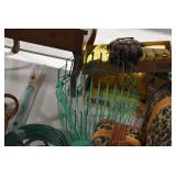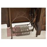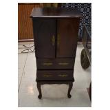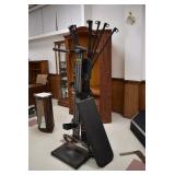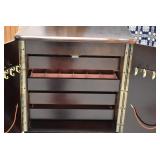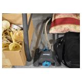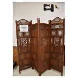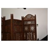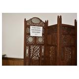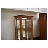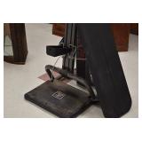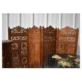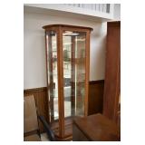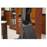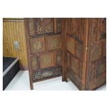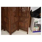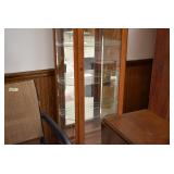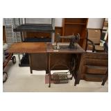 Furniture and Related: Ornate Oriental Wooden Carved Screen Divider, Jewelry Armoire, Gorilla Cart, Plastic Shelving, Wooden Shelves, Oriental Rug, Corner Cupboard, Bowflex, Lighted Curio Cabinet, Free Treble Sewing Machine on Stand, Various Chairs and Stands, and Other