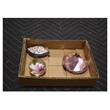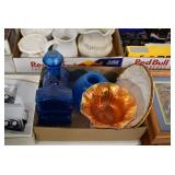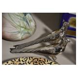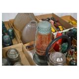Antique Glassware: Currier & Ives Early Winter Dish Set, Large Amount of Pink Depression Glass, Old Bottles, Swarovski Leopard, Kobalt Blue Glass, Fenton Glass, Ruby Glass, Lladro Eagle, Lladro Jester Sad Clown w/Box, Lladro Melancholy, Lladro Pensive Clown w/Box, Lladro Voyage of Columbus, Glass Animals, Glass Paper Weights, Fiestaware Plates and Bowls, Ned Smith Glass Bottle, Insulators, and Other
