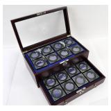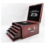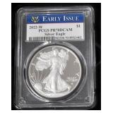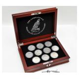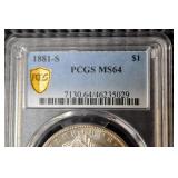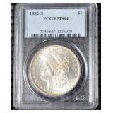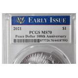 Absolute, online only, coin auction including approx. 140 Morgan, Peace and Silver Eagle silver dollars, from 1878 forward, silver commemorative coins, antique coins, coin sets in display cases, Ingot sets, 2 oz. silver coins, colossal coins, graded coins, gold-plated coins, several lockable wooden display cases, new supplies for collecting including new albums, slabs, protective cases, and books on grading coins. |