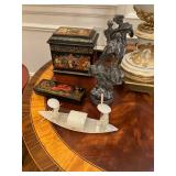 Private Sale By appointment only Please call 516-378-6613 to schedule your appointment Beautiful furniture, bric-a-brac and more! Maitland Smith Venice coffee table, antique gilt mirror with hand painted panel, writing desk and chairs, burled tall nesting tables, burled inlaid china closet, 2 panel giltwood peacock screen, fringe Bernhardt sofa, pair of rattan benches, French style bed & matching Bombay chests, 3 piece armoire with mirrored wardrobes, Yorkshire House end tables, 4 piece bedroom set, mahogany round pedestal table & chairs, printed sofa, pair of giltwood chairs, leather recliner & loveseat, rugs, lamps, beautiful bedding, lot of better decorative accent pieces, Tiffany style amber lamp, Bronze statue of children reading on a bench, sculpture, lots of signed oils and prints, Cathy Hardwick set of china, Staffordshire china, green Wedgewood, Riedel, Waterford, Limoges, Orrefors, flatware, throw pillows, jade dragon, men's clothing, belts, shoes, hats, sunglasses, ladies clothing & loads more! |