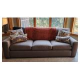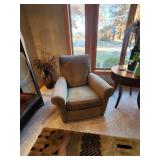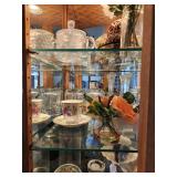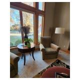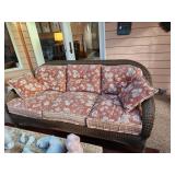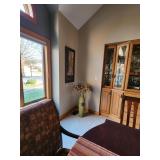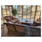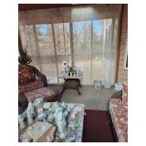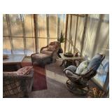 Patio accessories, fabulous wicker and granite patio set, modular modern bookcases, wonderful Ethan Allen furniture, chairs, large ottoman and 2 lighted art deco style display/curio cabinets, Ethan Allen Dining table with leaves and 8 chairs, Nepalese wool rug, American Leather brand couch, 2 leather recliners