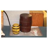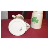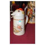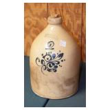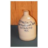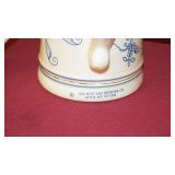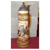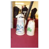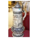 STONEWARE: 2 GAL. JUG WITH BLUE FLOWER "HAAXSTUN, OTTMAN & CO. FORT EDWARD, NY. STEINS: 19 1/4" METTLACH, 17" DUMLER & BREIDEN "ON TO THE DANCE" PORCELAIN, 16" 3-LITER GERMAN PORCELAIN.
