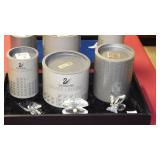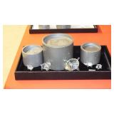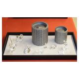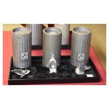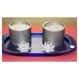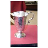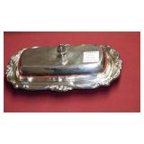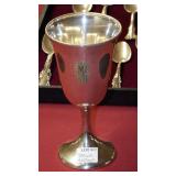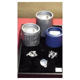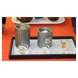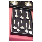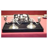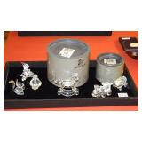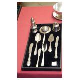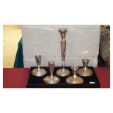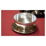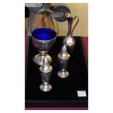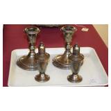 SEVERAL LOTS OF STERLING SILVER INCLUDING SUGAR SHAKER, BUTTER DISH WITH LID, TIFFANY & CO. 5 1/2" BOWL WITH UNDER PLATE, UTENSILS, CANDLE HOLDERS... "WHITING" STERLING/MIXED METALS HAND HAMMERED BUG & VINE FLASK.