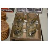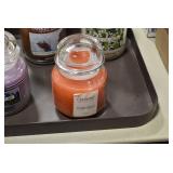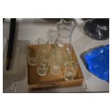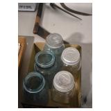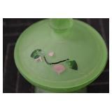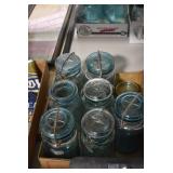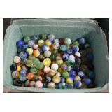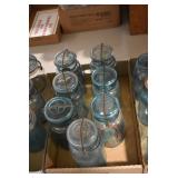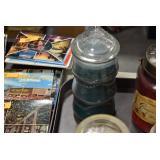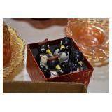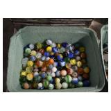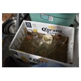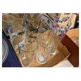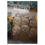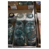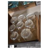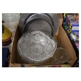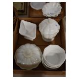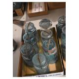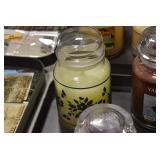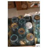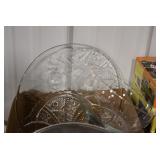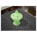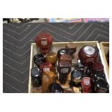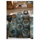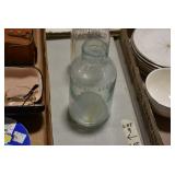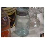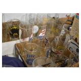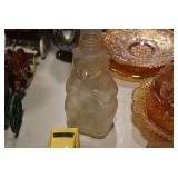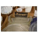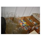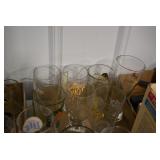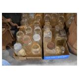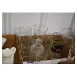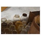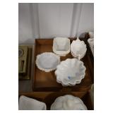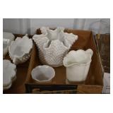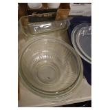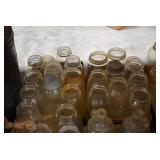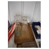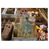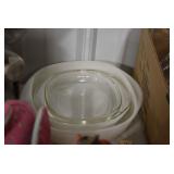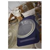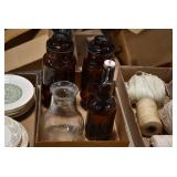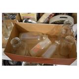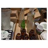 Antique Glassware: Large Amount of Various Colored Carnival Glass, Peanut Butter Glasses, Local and Other Milk Bottles, Uranium Glass, Fire King Dishes, Pyrex Dishes, Glass Figures, Glass Baskets, Milk and Other