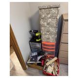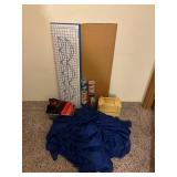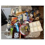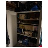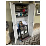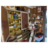 Lot #341 - Cabinet full of Tools, Camping Equipment, Crafting Supplies, Yard Decor, Tarps, Bags & More