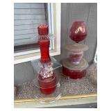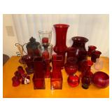Lot #93 - Red Glassware Collection - Vases, Candle Holders, and Decorative Pieces.