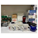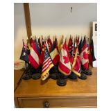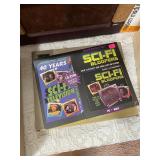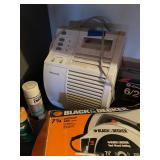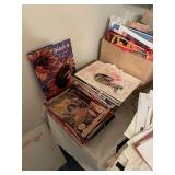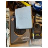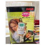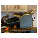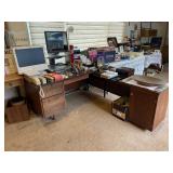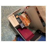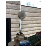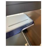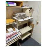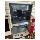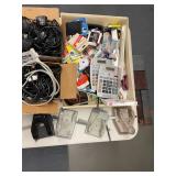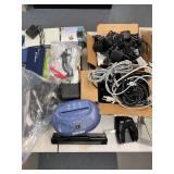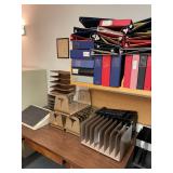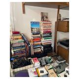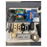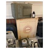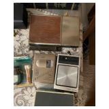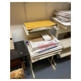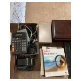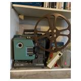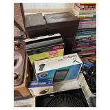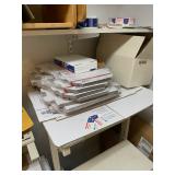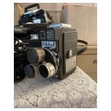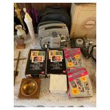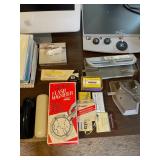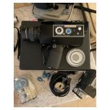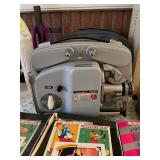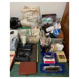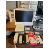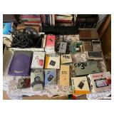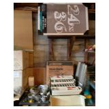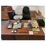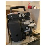 Vintage camcorders including an Elmo Super & Sound 6008 with travel case, Super-800 Electro camcorder, a JVC GR-c1 Video Movie camcorder with hardcase, vintage Weber Electromatic Memory Reel-to-Reel, Sony Handycam video camera recorder Video 8 CCD-F70, flag collection from around the globe, AIWA Walkman, Sony Walkman, Sanyo Walkman, Krystal XLP portable tape player, vintage Lexicon LK-3000 calculator, Sony desk speaker system #SRS3, The C64 Mini game console with 64 games included, Zeiss 10 x 40B binoculars made in Germany, Apple iPad, iMac G5, Clear View Optelec magnifier monitor projector, office supplies, note cards and blank greeting cards, Goko Editor Viewer NF-4004 S-8, Canon Powershot SD850 IS, Olympus D-220L digital camera, vintage Holiday II camera, Kodak carousel projector, Kodak carousel slide trays, vinyl records including movie soundtracks, vintage Bolex 18-5 8mm movie projector in mint condition, Bell & Howell Autoload 1585C movie projector, Xerox Workcentre Pro C2128 and ink cartridges, mid-century modern office desks, vintage metal filing cabinets, office chairs, printers, and two Ultrafold letter folders 714.