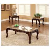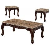 - Crafted with brown faux marble tops and traditional styling, the Beltran wooden table set epitomizes sophistication and exquisite craftsmanship. Its ornate floral wood carvings and Cabriole style legs add a touch of elegance to any living space.