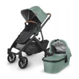 (142). UPPAbaby Vista V2 Stroller/Convertible Single-to-Double System/Bassinet, Toddler Seat, Bug Shield, Rain Shield, and Storage Bag Included/Gwen (Green Mélange/Carbon Frame/Saddle Leather)