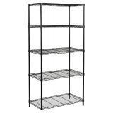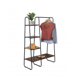 Artfully organize and show off your hanging clothes and folded garments with this black clothing rack. Its modern silhouette features rounded corners, a sturdy hanging bar for clothes, and 4 shelves. Shine a little light on this beauty and the color palette is equally as stunning. The assortment of natural-tone wood shelves not only boldly contrast the black frame but it gives this clothing display an extra kick of storage. The smaller shelves are a go-to for everything from organizing folded clothes to displaying accessories. Meanwhile, the large bottom shelf is the perfect place to slip storage baskets, shoes, or boots. This modern clothing rack instantly adds storage to both large and small spaces alike. Use it to plan your outfits, keep baby clothing in arm's reach, add clothing storage to a tiny apartment, or infuse your home with a touch of modern farmhouse style—the possibilities are endless.