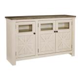 Whether your style is farmhouse fresh, shabby chic or country cottage, you’ll find the Bolanburg large TV stand perfectly in tune. Its two-tone finish pairs a trendy textured antiqued white with a weathered gray for that much more quaint character. Charming elements include crossbuck adorned cabinet doors with glass inlays for peek-through flair. Ample adjustable shelving and cutouts for wire management nicely accommodate your media needs.